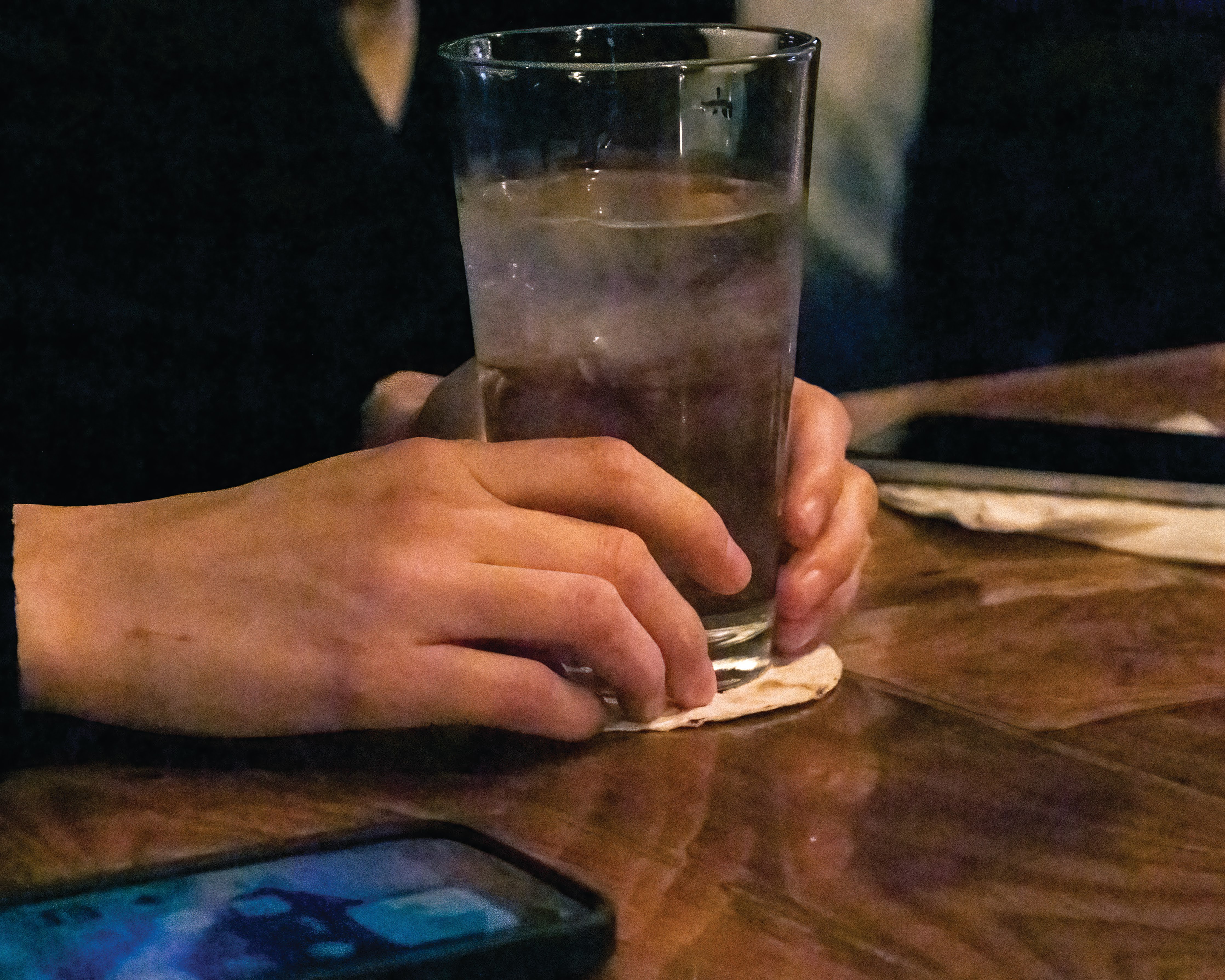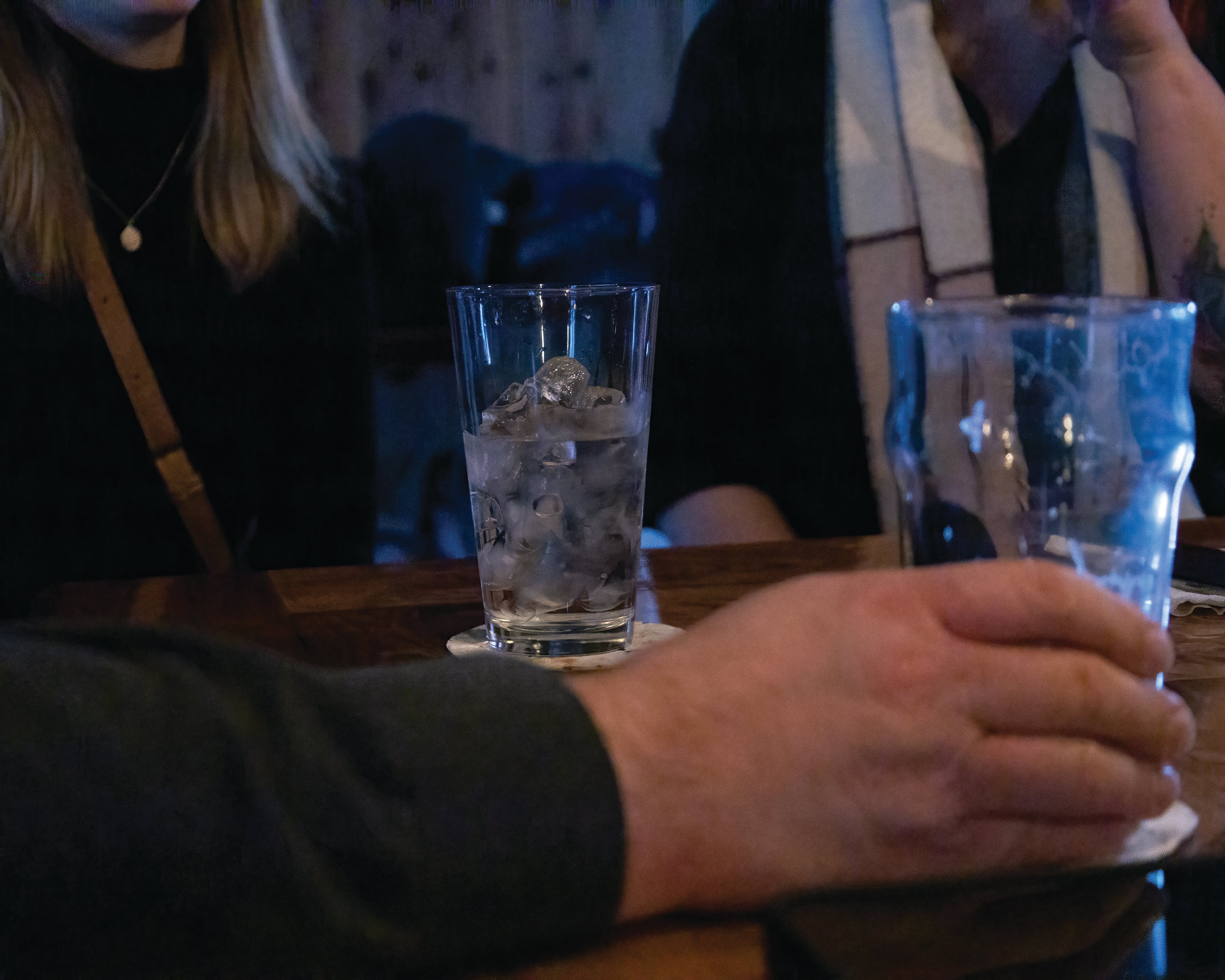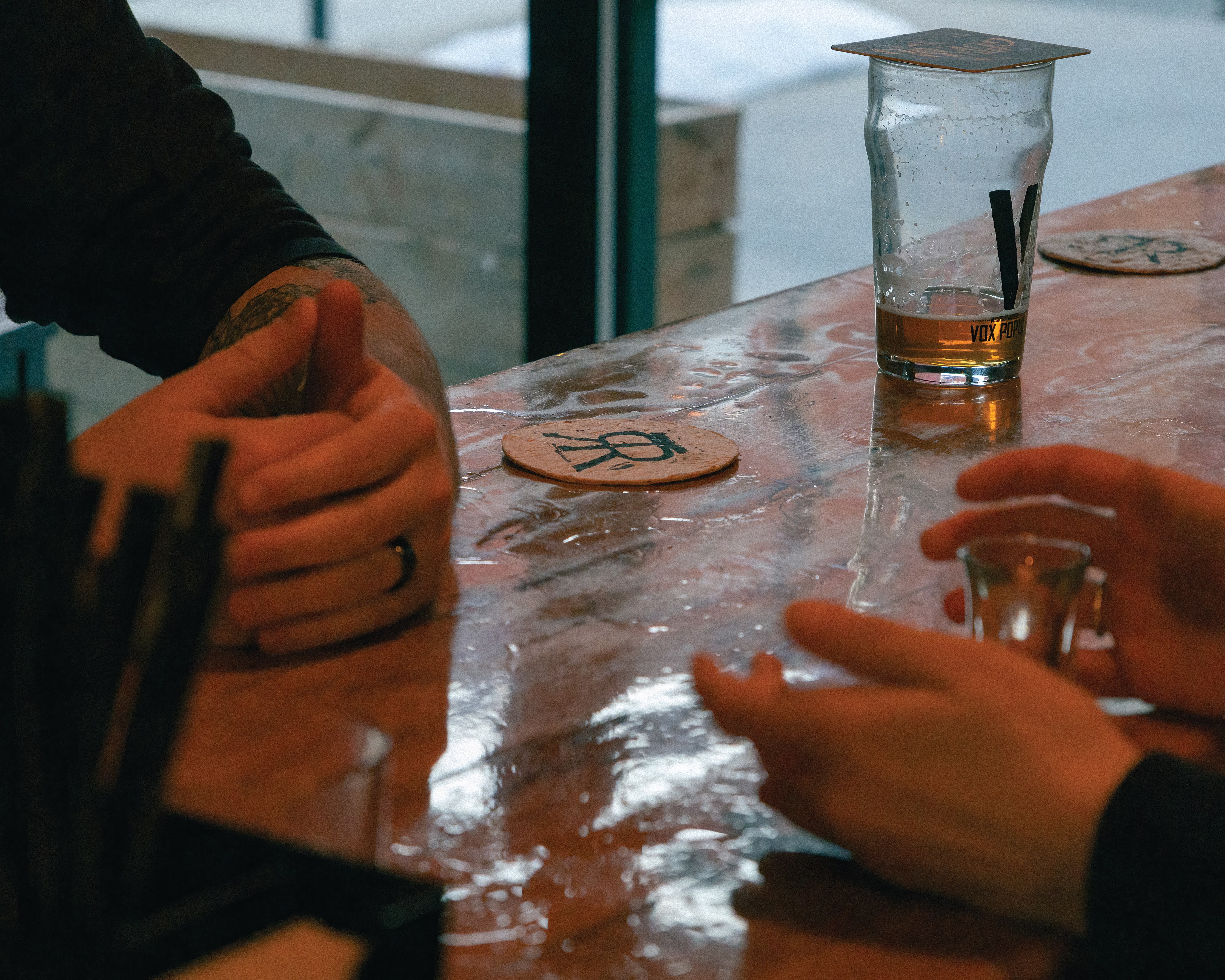 Les six photographies présentent des mises en situation de l’utilisation de l’objet du sous-bock. Les sous-bocks sont composés des vestiges d’une discussion avec les étudiant·es de notre programme à la maîtrise. Les composantes des sous-bocks sont les matières retenues lors de cet échange (assiettes en papier, napperons, thé, café et gâteau). Ainsi, avant même d’être utilisé, le sous-bock est déjà chargé du rapport à la collaboration. Ces sous-bocks sont ensuite présentés à des clients du bar le Minotaure. Par la documentation photographique, on présente alors l’objet dans sa fonction comme dispositif qui permet de favoriser les échanges et les discussions.